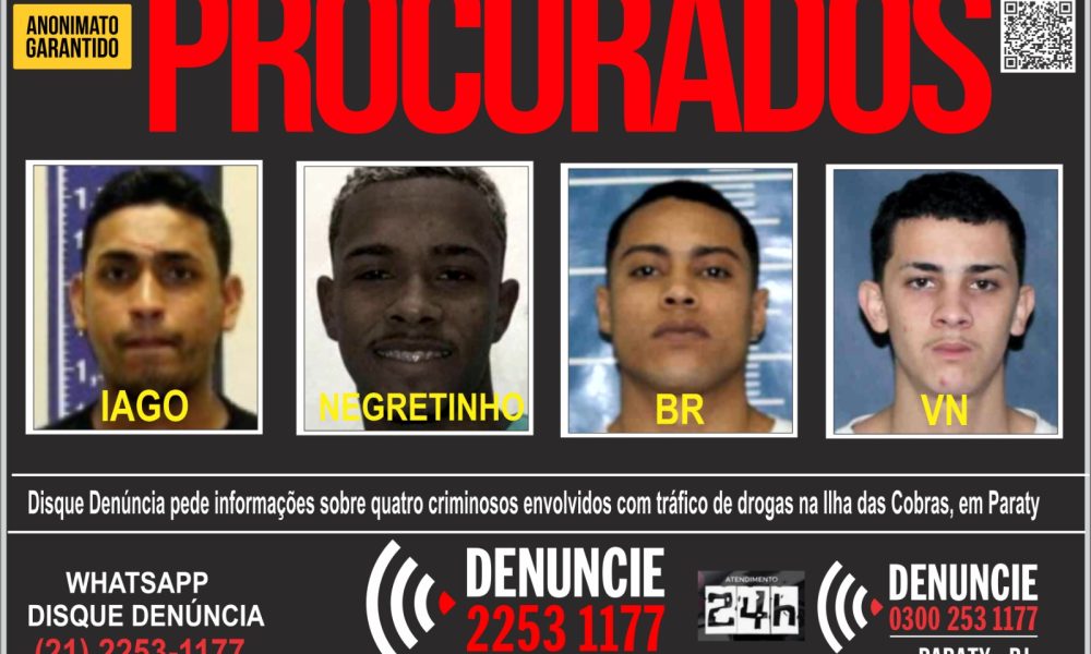 O Disque Denúncia divulgou neste domingo (28) um cartaz solicitando informações que ajudem a polícia a localizar e prender quatro traficantes ligados à facção Comando Vermelho...