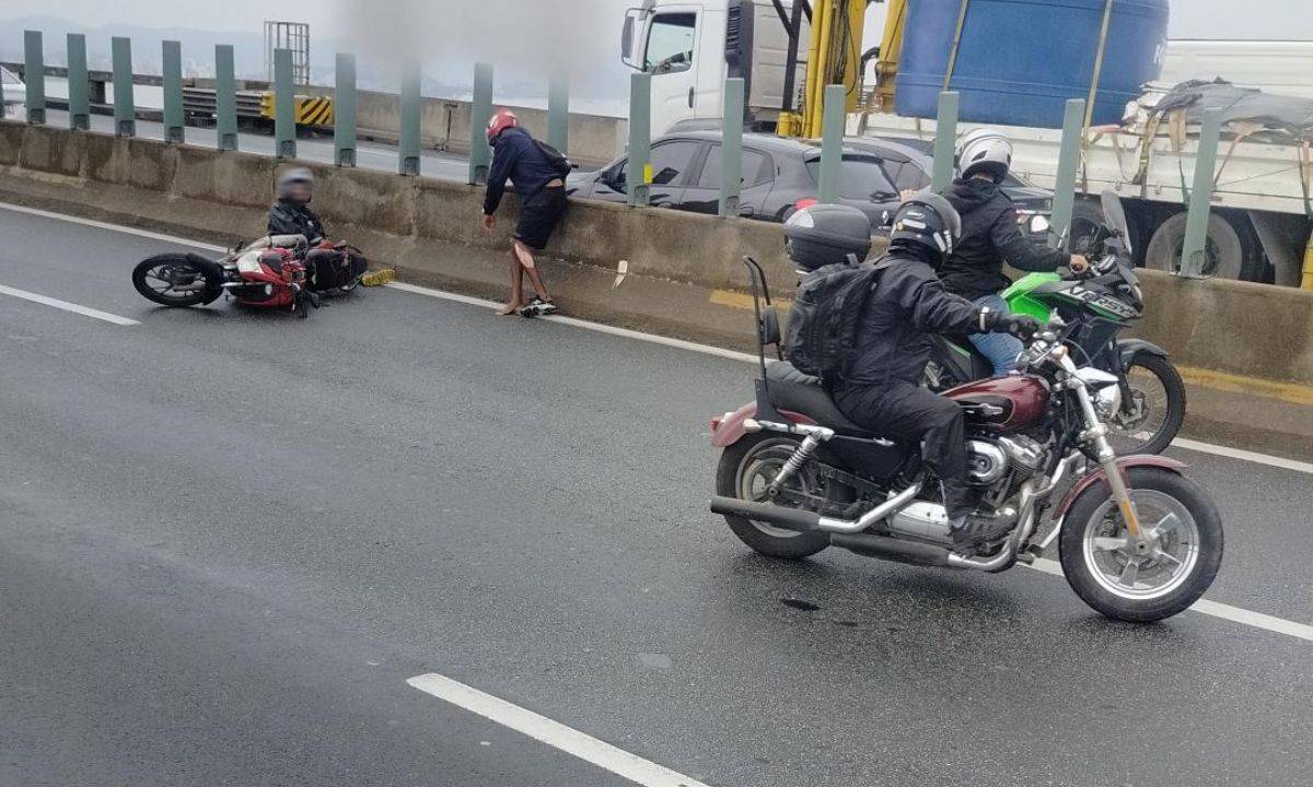 Um motociclista sofreu uma queda na Ponte Rio-Niterói, na altura do Vão Central, no sentido Rio de Janeiro, na manhã desta terça-feira, após escorregar na pista molhada em meio à chuva contínua. O acidente provocou um grande susto e causou lentidão intensa no trânsito, afetando motoristas que seguiam para a capital.