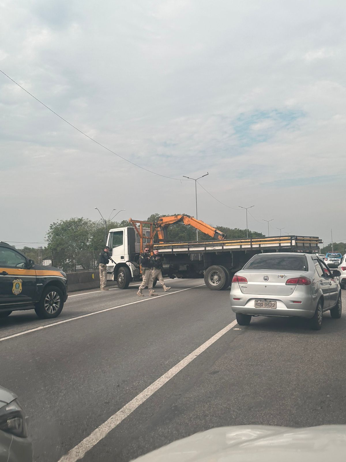 Um caminhão atravessado na pista sentido Itaboraí provocou o fechamento total da BR-101, na altura do km 312, próximo ao Piscinão de São Gonçalo, na Região Metropolitana do Rio, na tarde desta segunda-feira (27).