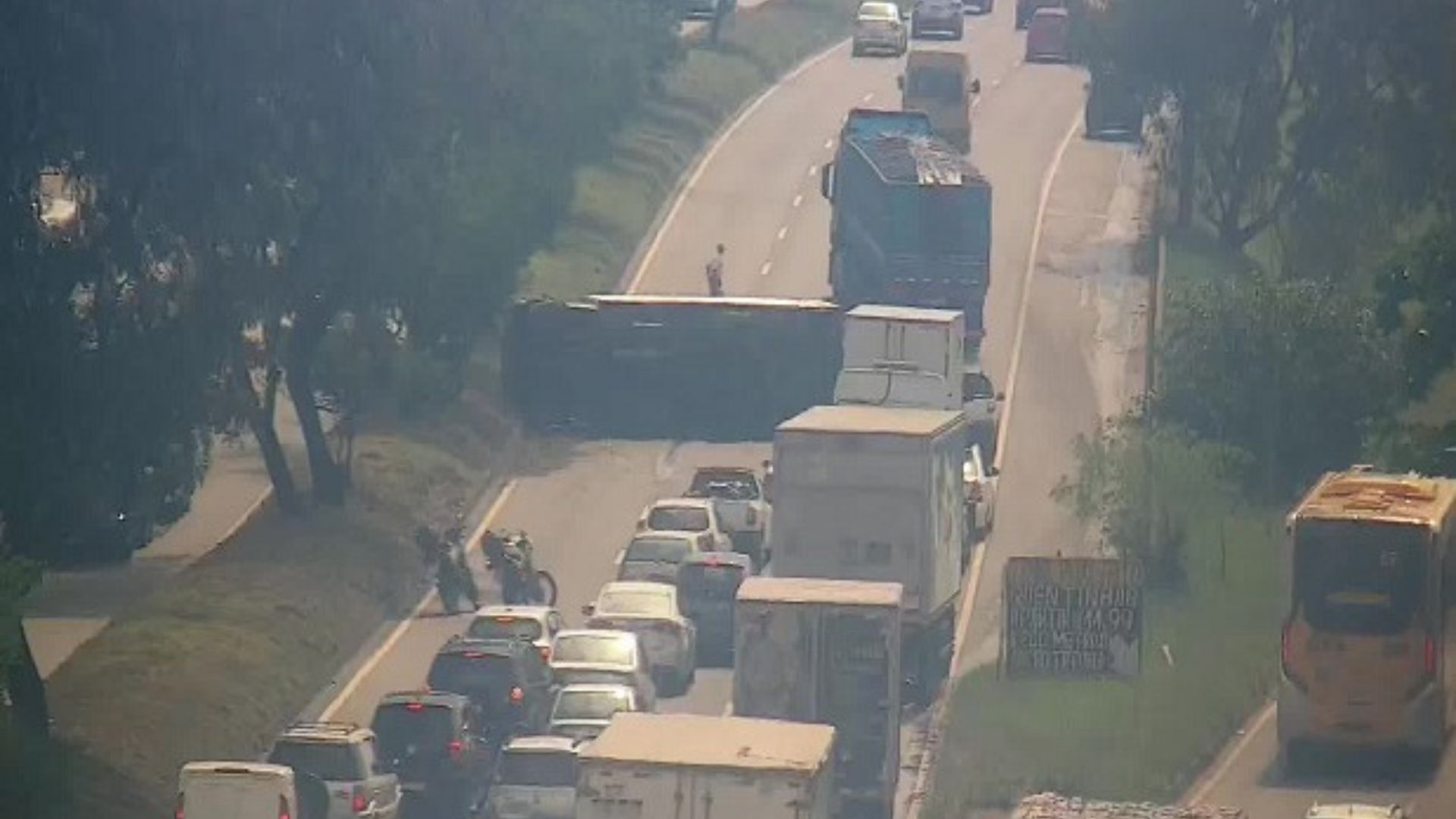 Caminhão tomba e bloqueia faixas da Avenida Brasil em Santíssimo, no sentido Santa Cruz