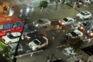 No Centro de Niterói, ônibus e carros ficaram parados, sem conseguir seguir viagem. Mesmo diante do perigo, muitos motoristas insistiram em atravessar áreas alagadas, colocando em risco a própria vida.