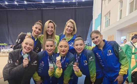 Brasil conquista prata na ginástica rítmica mais uma vez na Copa do Mundo da modalidade. O conjunto brasileiro subiu ao pódio neste domingo (19), na etapa realizada em Baku, no Azerbaijão, confirmando a boa fase da equipe na temporada internacional.