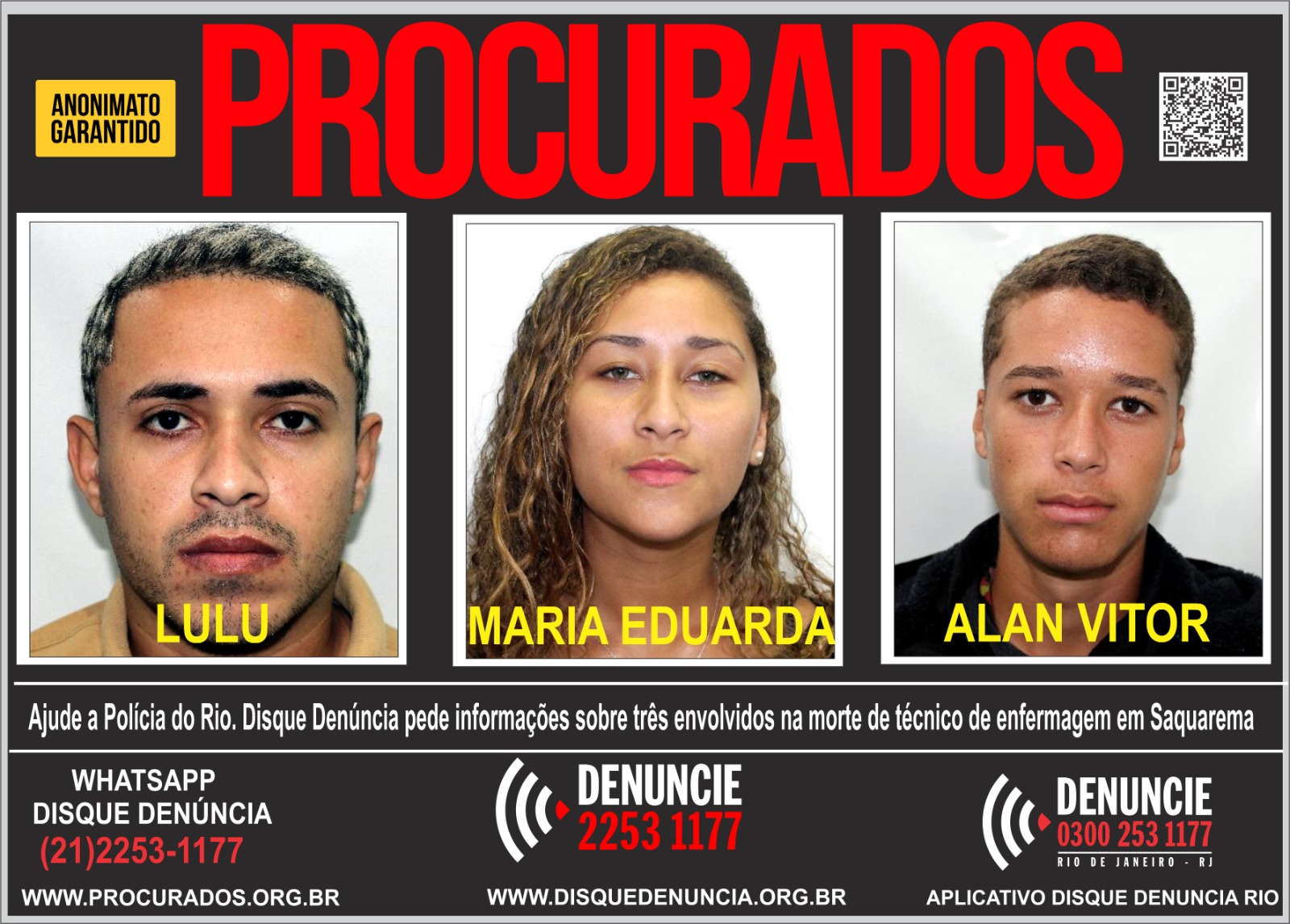 O Disque Denúncia divulgou nesta quinta-feira (29) um cartaz com fotos e informações de três suspeitos de envolvimento no assassinato do técnico de enfermagem Fábio Corrêa Oliveira, de 27 anos, encontrado morto e enterrado em uma área de mata no bairro Vilatur, em Saquarema, na Região dos Lagos. Ele estava desaparecido desde o domingo de Páscoa, 20 de abril deste ano.