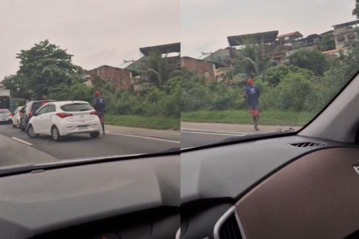 Nas imagens, é possível ver o suspeito se aproximando do carro. O motorista consegue escapar acelerando, enquanto Fabiano segue para as margens da rodovia.