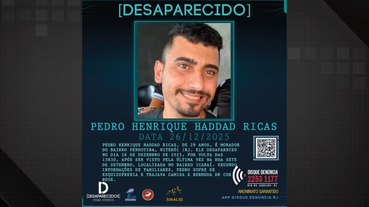 Quem tiver qualquer informação sobre o paradeiro de Pedro Henrique Haddad Ricas pode entrar em contato com a DHNSG, pelo WhatsApp (21) 98596-7156, ou com o Disque-Denúncia, pelo telefone (21) 2253-1177.