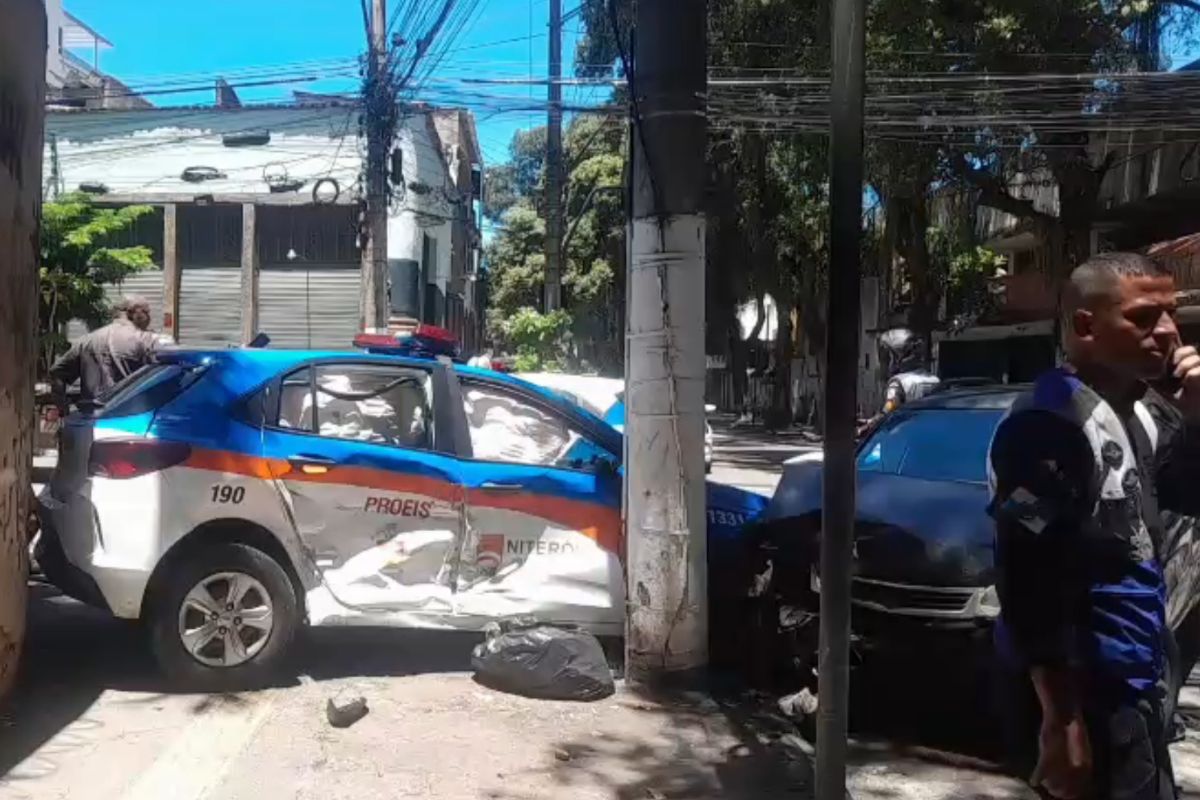 Viatura do Proeis e veículo roubado após colisão durante perseguição no Centro de Niterói.
