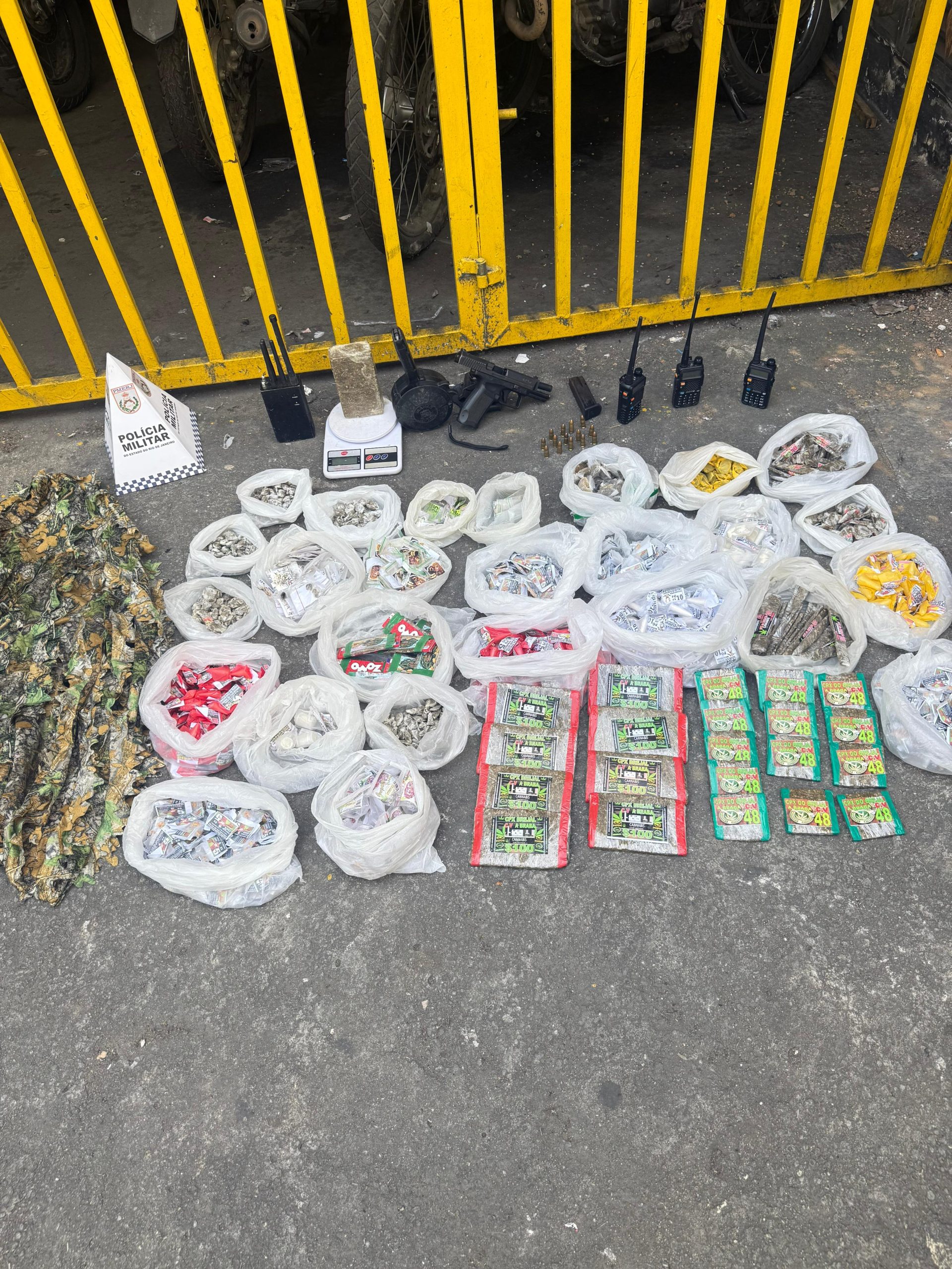 Outro suspeito, identificado apenas pelo vulgo “Coroa”, portava uma mochila camuflada contendo entorpecentes ainda a serem contabilizados e um rádio transmissor.