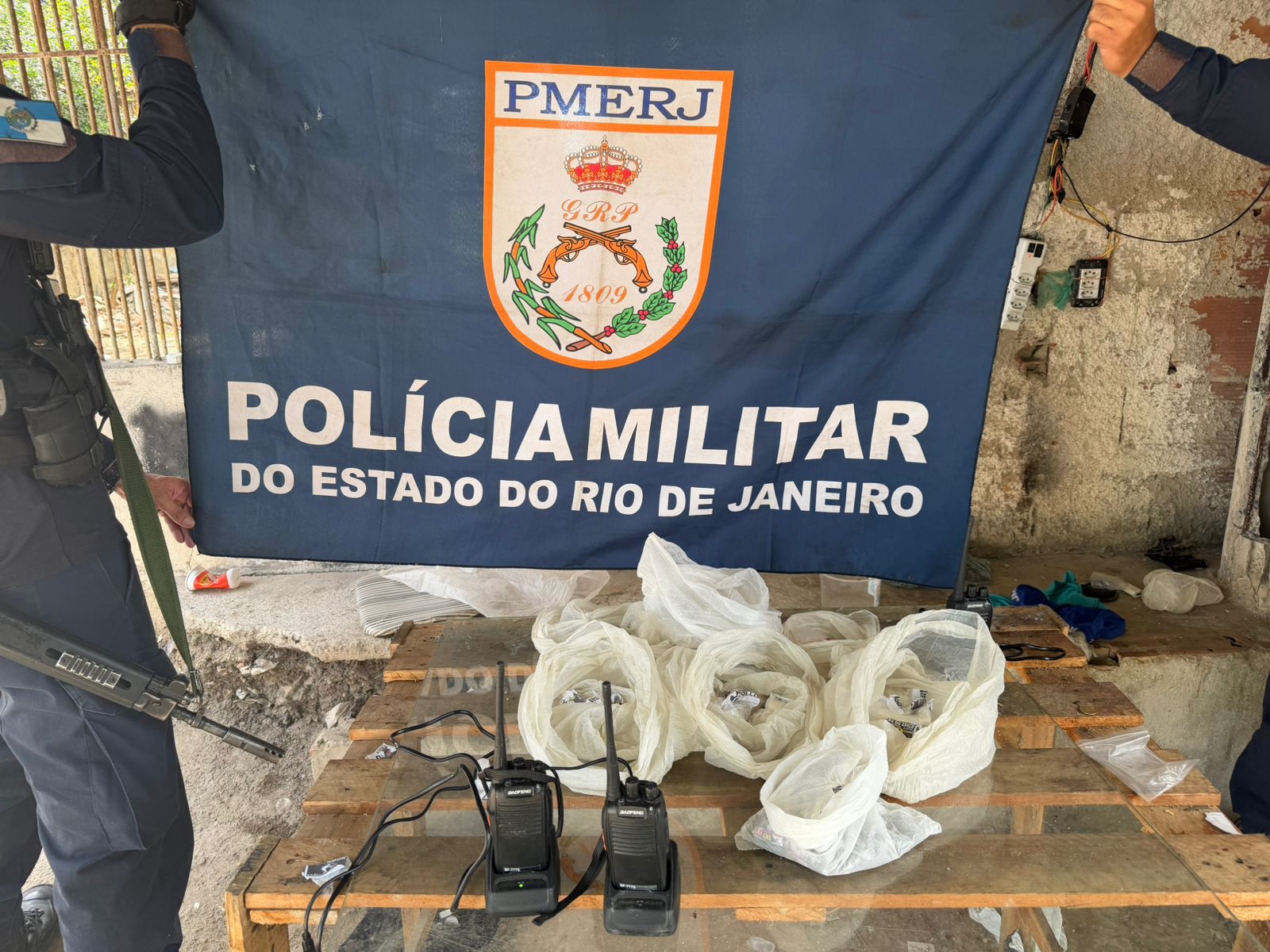 Durante a abordagem, os policiais apreenderam entorpecentes, ainda em fase de contabilização, e três rádios transmissores, equipamentos usados para comunicação entre integrantes da atividade criminosa.