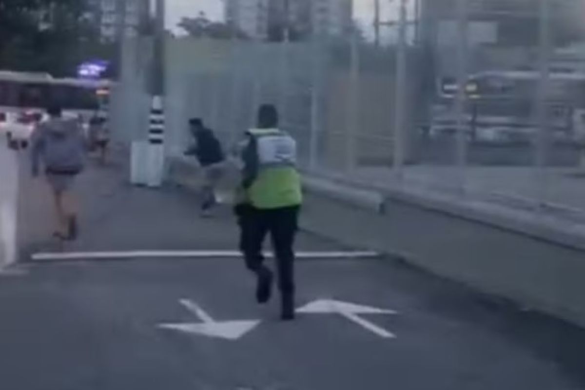 Vídeos que circulam nas redes sociais mostram o momento em que um homem atinge um dos agentes pelas costas, levando o policial a disparar três tiros. O suspeito consegue fugir e as imagens não permitem saber se ele foi atingido.