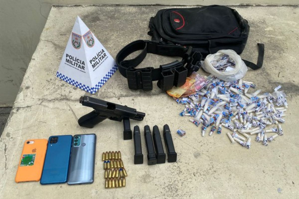 Policiais do 35º Batalhão de Polícia Militar (35BPM) apreenderam uma pistola 9 mm, drogas, munições, carregadores e outros materiais durante uma ação na localidade Gebara, em Itaboraí, na tarde desta segunda-feira (18).