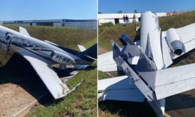 Avião sai da pista após pouso em aeroporto de Jundiaí e colide contra barranco