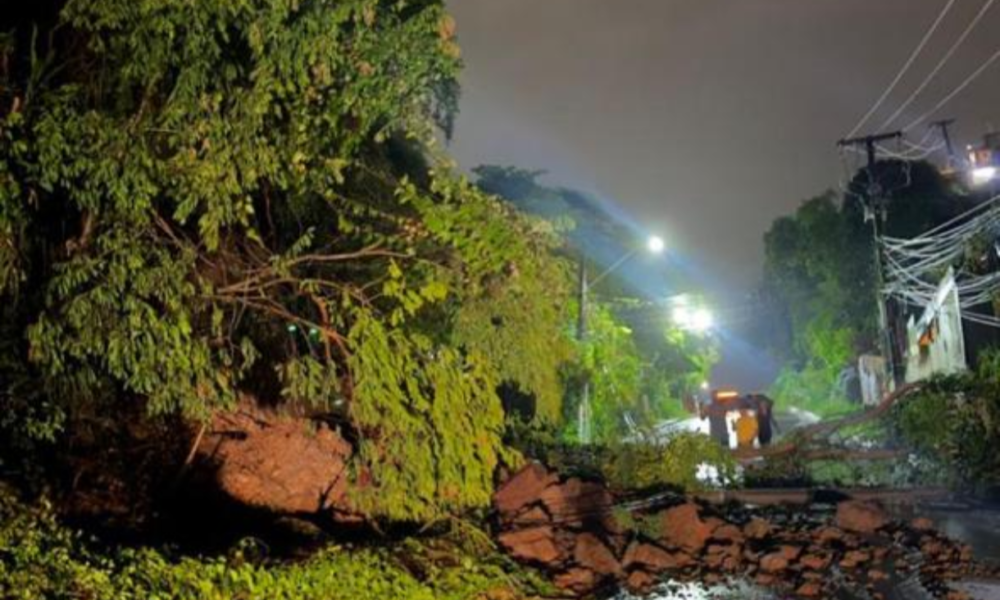Deslizamento de pedras interdita Rua Doutor March em Niterói e derruba poste de energia